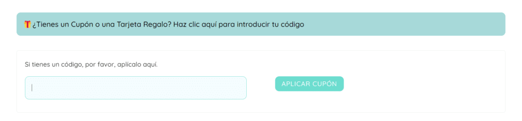 - Haz clic en el mensaje «🎁¿Tienes un Cupón o una Tarjeta Regalo? Haz clic aquí para introducir tu código» y se abrirá la caja para meter el código. Introduce el código de la tarjeta regalo.
